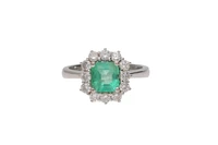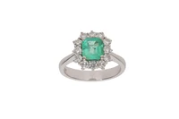 Anello con smeraldo e cornice di diamanti ed una pietra, realizzato in oro bianco 750, smeraldo ct 1 circa e diamanti taglio brillante ct 0,55 ca tot colore H-J, purezza VVS-VS, imperfezioni, misura 14 - Grammi 5,00