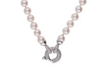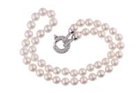 Collana di perle coltivate, chiusura impreziosita da pave' di diamanti e realizzata in oro bianco 750, diamanti taglio brillante ct 0,70 ca tot, colore H-J, purezza VVS-VS, imperfezioni, perle mm 8 ca, lunghezza cm 50 - Grammi 51,50