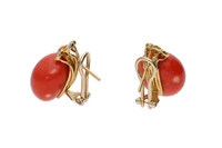Paio di orecchini con bottoni di corallo sormontati da fantasia di piccole foglie impreziosite da diamanti, realizzati in oro giallo 750, diamanti taglio brillante ct 0,50 ca tot, colore H-J, purezza VVS-VS, chiusura perno e clip, ,lievi imperfezioni, diametro corallo mm 18,5 ca, dim cm 2,6 circa - Grammi 22,80