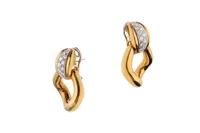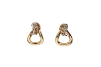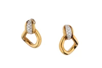 Paio di orecchini pendenti con pave' di diamanti, realizzati in oro bicolore 750, diamanti taglio brillante ct 1,8 ca tot, colore G-I, purezza VVS-VS, chiusura a clip, imperfezioni, dim cm 4x2,8 - Grammi 26,80