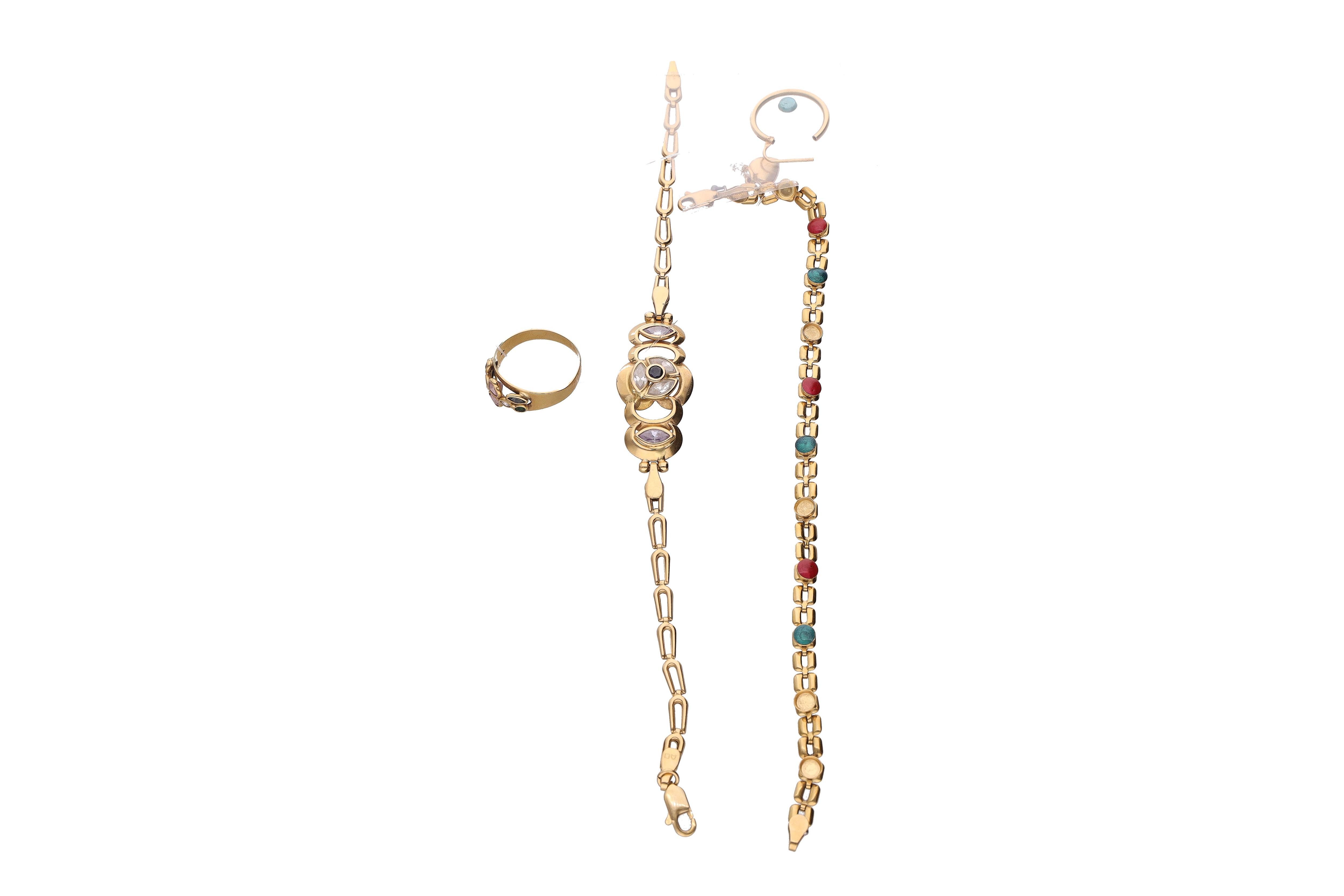 1 ciondolo, 1 orecchino in oro 1,6g - 1 anello, 2 bracciali in oro, pietre, parti staccate 18,3g - difetti (#of13.5g) - Grammi 19,90