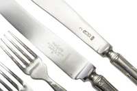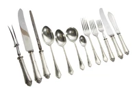 Mappin&Webb Sheffield, 1970-71, servizio in argento 925, composto da: 6 forchette, 4 cucchiai, 6 cucchiai dolce, 6 cucchiai gelato, 5 cucchiaini, 6 forchettine dolce, 12 posate pesce in argento parte altro materiale, f.p. 12 coltelli e 3 posate manico argento parte metallo altro materiale 1073.8g - Grammi 2.427,70