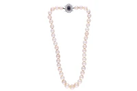 Collana di perle con fermezza realizzata in oro 750 e platino con diamanti e zaffiro, diamanti taglio brillante ct 1,5 totali circa, colore I-K, purezza VS-SI, lunghezza 40 cm, difetti - Grammi 45,30