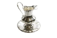 Versatoio con piatto, realizzato in argento 800 decorata con martellature e baccellature, diam piatto 22 cm, dimensioni totali 22,5 x 20 x 10,5, ammaccatura, difetti - Grammi 603,40