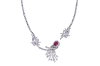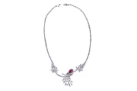 Collana con rubino e diamanti, realizzata in oro bianco 750, rubino con sostanza colorata taglio composito di forma a goccia, diamanti taglio brillante ct 5 totali circa, colore H-J, purezza VS-SI, lunghezza 41,5 cm, parti rotte, staccate, saldate, gravi difetti - Grammi 34,20