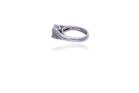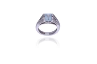 Anello con acquamarina e diamanti, realizzato in oro bianco 750, acquamarina taglio a gradini, forma rettangolare ad angoli tronchi, affiancata da diamanti taglio brillante ct 0,60 totali circa, colore H-J, purezza VS-SI, 1 mancante, misura 18, lievi difetti - Grammi 10,80