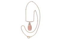 Collier con catena ed elemento centrale impreziosito da diamanti e cabochon ovale in corallo rosa pendente, realizzato in oro giallo 750, diamanti taglio brillante ct 0,50 ca tot, colore H-J, purezza VVS-SI, dimensioni cabochon cm 1,9x1,2 ca, imperfezioni, lunghezza cm 42 - Grammi 9,30