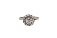 Anello a margherita con diamanti, realizzato in oro bianco 750, diamante centrale taglio brillante ct 0,65 circa, colore J-L, purezza VVS2-VS1, diamanti di contorno taglio huit huit ct 0,10 ca tot, presenza di scheggiature, colore I-K, purezza VVS2-VS1, imperfezioni, misura 15 - Grammi 3,60