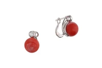 Paio di orecchini con sfere di corallo e diamanti, realizzati in oro bianco 750, diamanti taglio brillante ct 0,20 ca tot, colore H-J, purezza VVS-VS, chiusura perno e clip, corallo mm 11 ca, da rilucidare, imperfezioni - Grammi 7,70