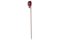 Spilla con diamante e pietra, realizzata in oro basso, diamante taglio vecchio ct 0,10 circa, difetti - Grammi 2,10
