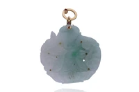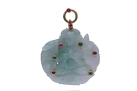 Ciondolo con giada trattata, rubini e smeraldi, parti realizzate in oro giallo 750, rubini e smeraldi taglio cabochon di forma rotonda, giada trattata scolpita, due elementi mancanti, difetti - Grammi 38,50