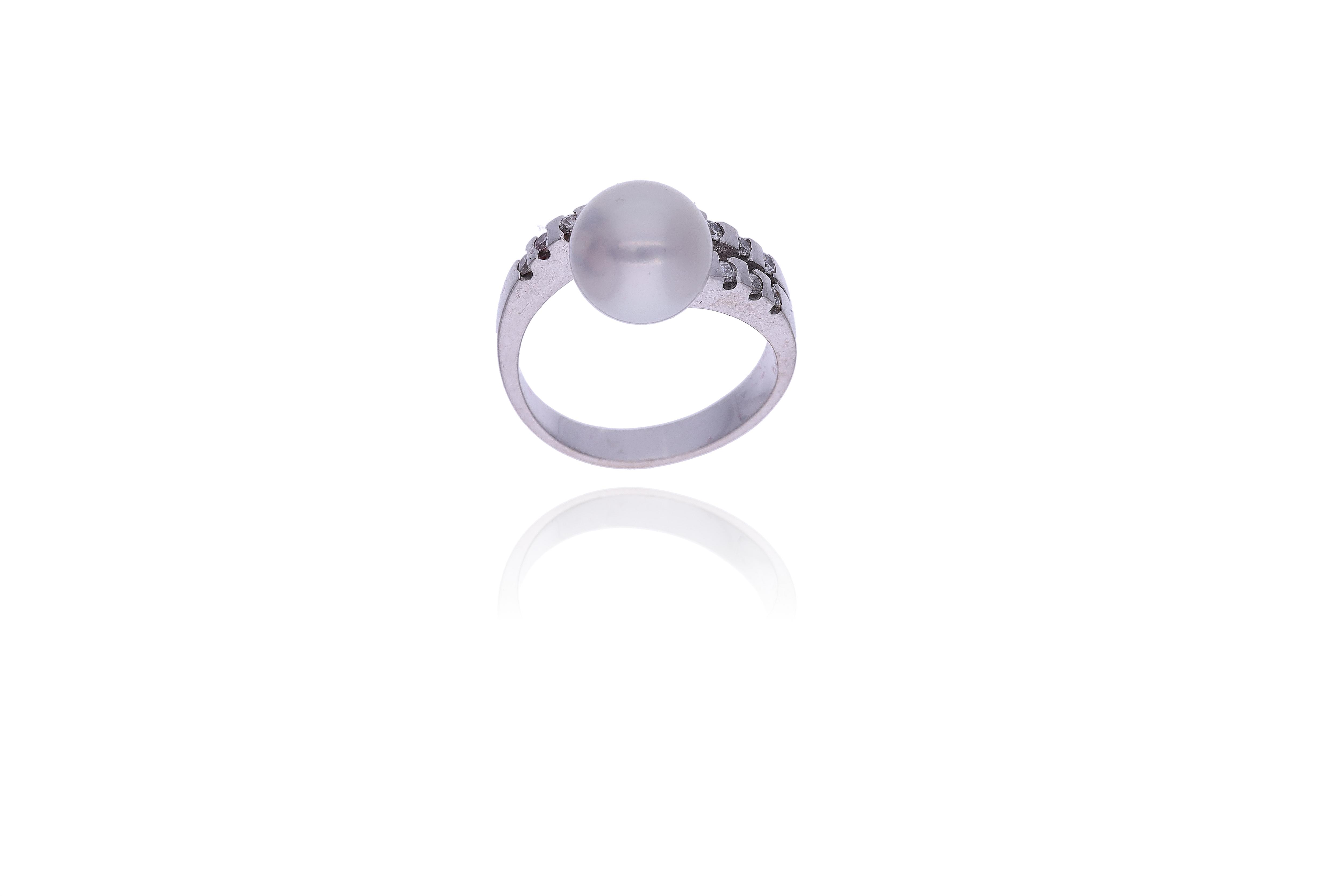 Anello con perla coltivata e diamanti, realizzato in oro bianco 750, perla coltivata mm 8,5-9, affiancata da diamanti taglio brillante ct 0,20 totali circa, colore H-J, purezza VS-SI, misura 15, difetti - Grammi 7,20