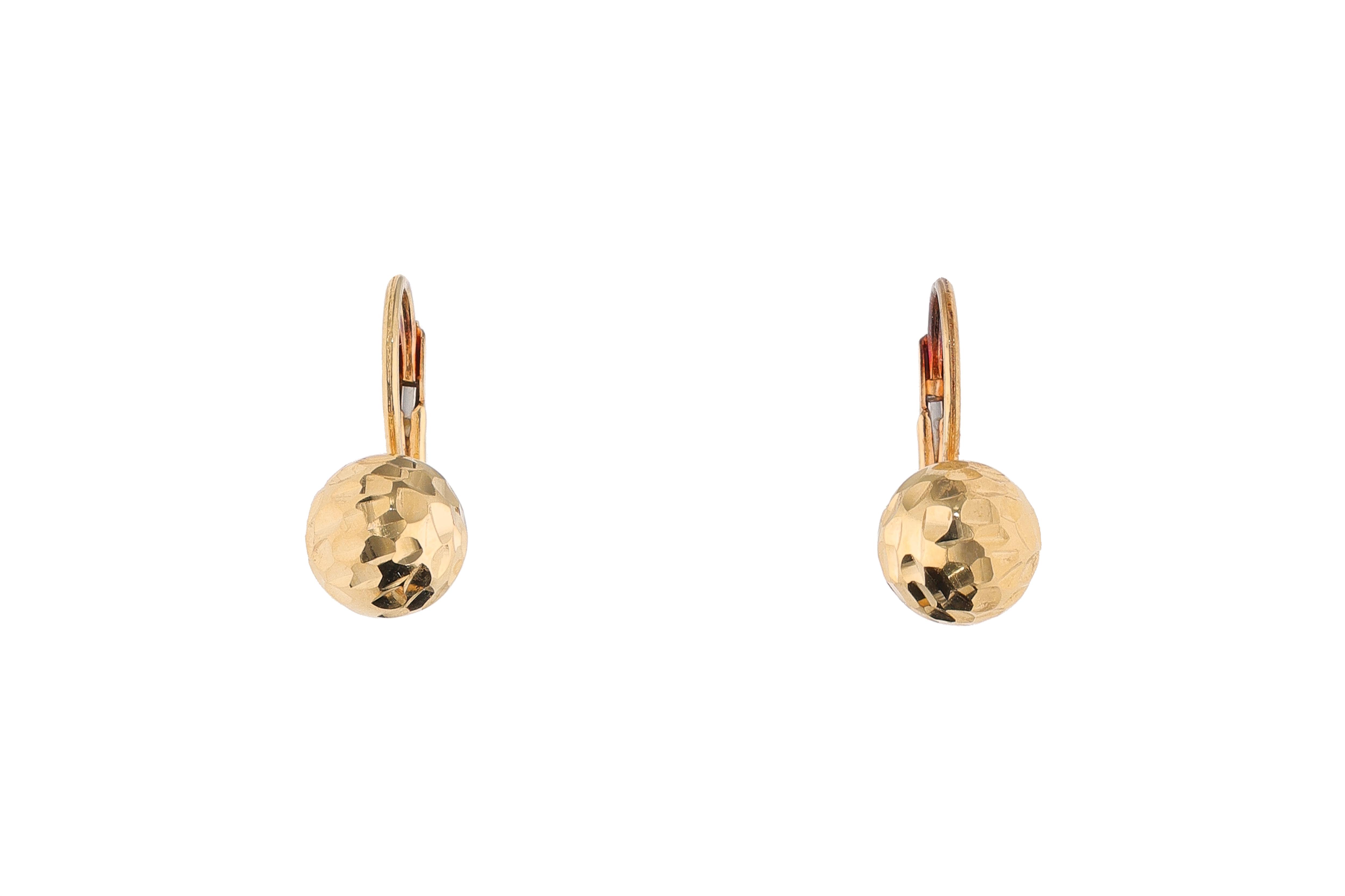 Paio di orecchini con sfere diamantate, in oro giallo 750, imperfezioni, chiusure ponte e molla, dim cm 1,5 - Grammi 3,20