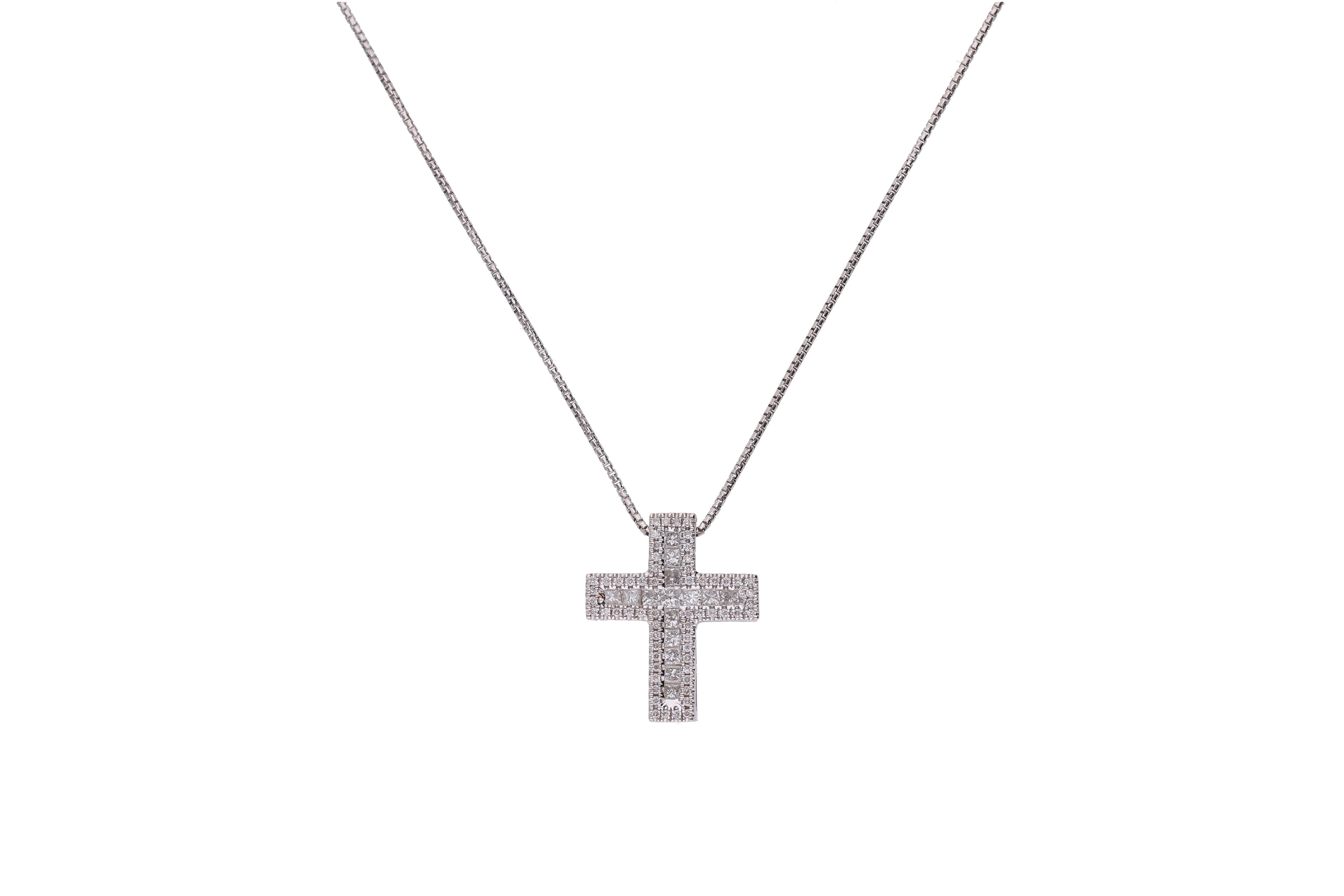 Collana con elemento mobile a croce, ornato da diamanti e realizzati in oro bianco 750, diamanti taglio brillante e princess ct 0,50 ca, colore H-J, purezza VS-SI, lunghezza regolabile cm 44, dim pendente cm 1,4x1,6 - Grammi 3,90