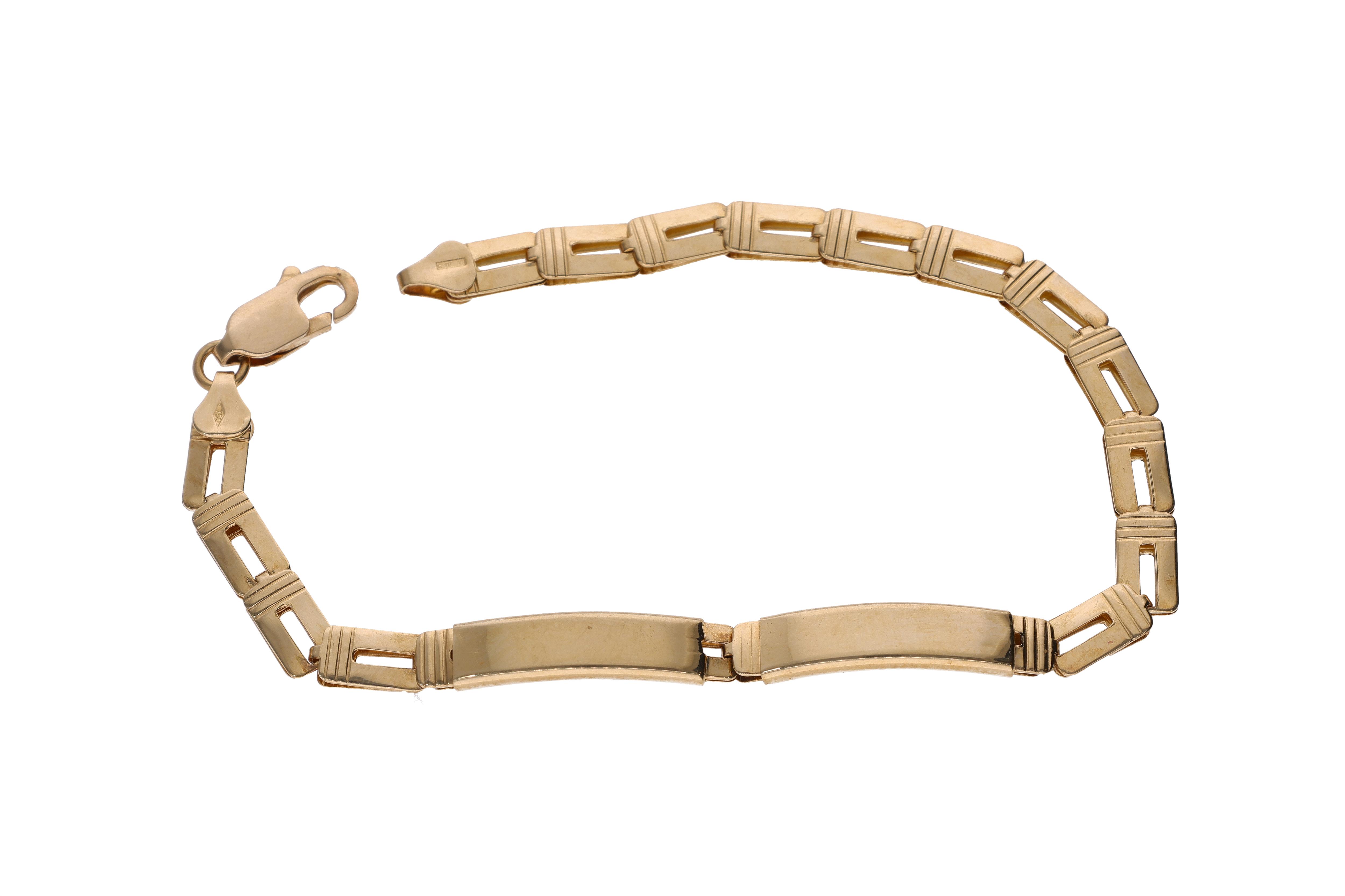 Bracciale a maglie rettangolari e due piastrine, in oro giallo 750, imperfezioni, lunghezza cm 21 - Grammi 12,30