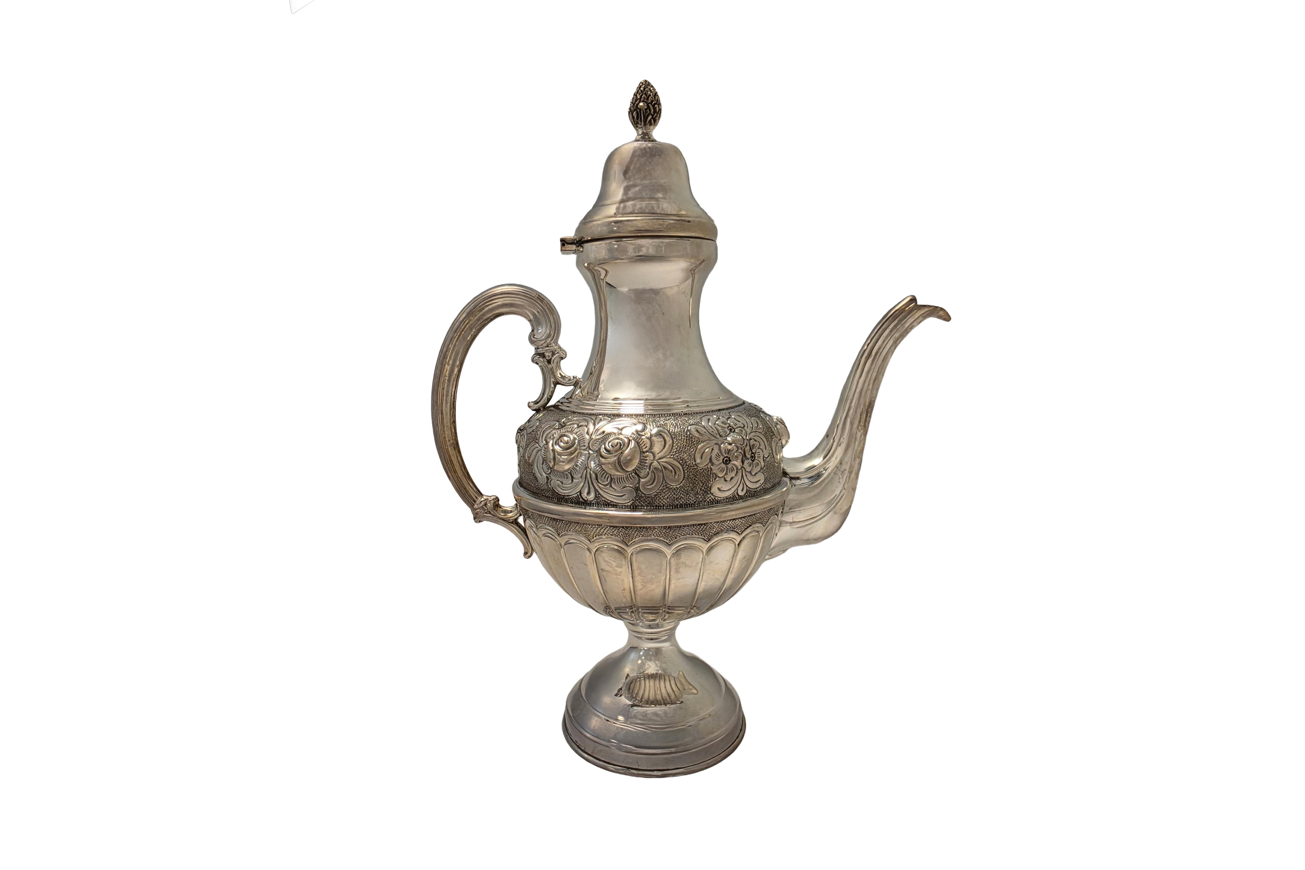 Caffettiera in argento 800, con corpo bombato, fascia decorativa cesellata a bouquet di fiori, costolature e pomolo a pigna, imperfezioni, h cm 35 - Grammi 880,00