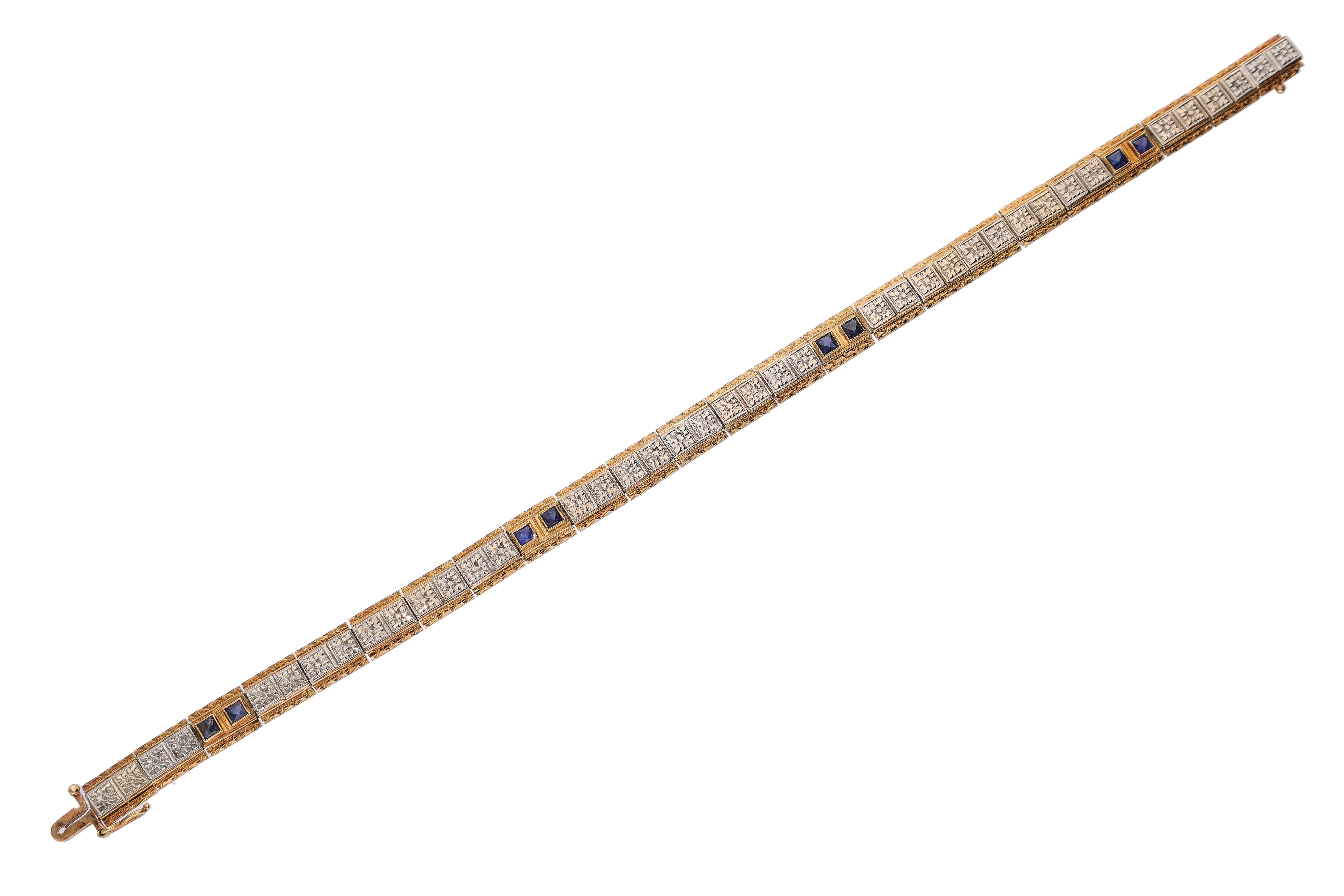 Bracciale a fascia con zaffiri, realizzato con elementi mobili a motivo geometrico, in oro bicolore titolo inferiore, chiusura a scomparsa con sicurezza, imperfezioni, scheggiature, lunghezza cm 20 - Grammi 14,10