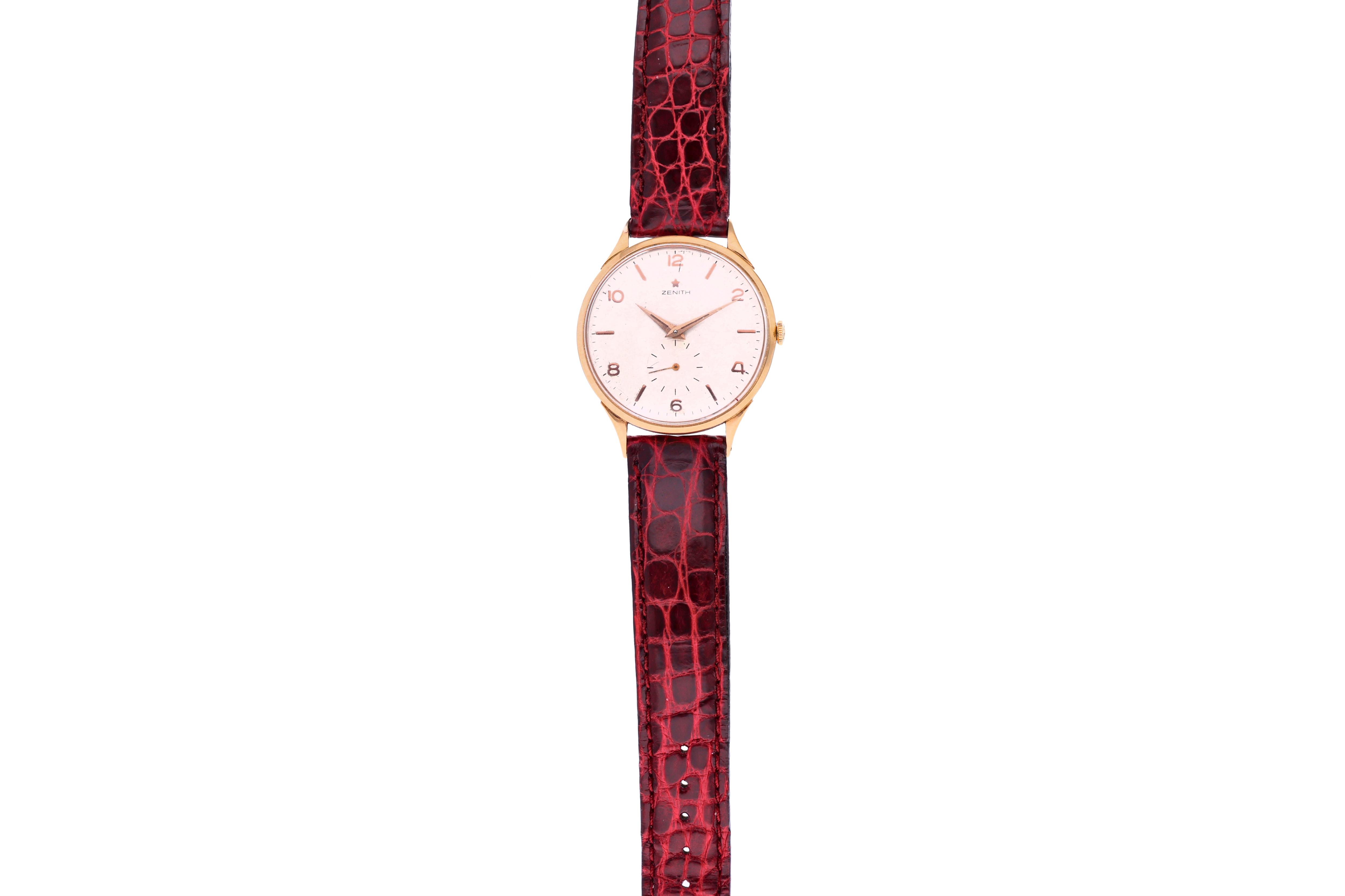 Orologio con cassa in oro, movimento meccanico manuale Zenith cal. 106-6, cinturino in pelle con fibbia ad ardiglione in metallo, piccoli secondi a ore 6, dimensioni 36 mm - ammaccature, quadrante ristampato, imperfezioni, si consiglia assistenza tecnica - Grammi 36,00