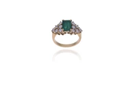 Anello con smeraldo e diamanti, realizzato in oro giallo 750, smeraldo taglio gradini di forma rettangolare ad angoli tronchi, diamanti taglio brillante, ct 0,50 totali circa, colore I-K, purezza VS-SI, misura 14, difetti - Grammi 6,00