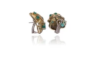 Sabbadini, paio di orecchini con smeraldi e diamanti, realizzati in oro bicolore 750, smeraldi taglio composito e cabochon di forma ovale, diamanti taglio brillante ct 1 totali circa, colore H-J, purezza VS-SI, con referto di analisi gemmologica n. 238/25, scheggiature e incrinature, imperfezioni - Grammi 23,60