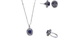 Parure con diamanti e pietre, realizzata in oro bianco 750, composta da collana, paio di orecchini e anello, diamanti taglio brillante e baguette ct 3 totali circa, colore I-K, purezza VS-SI, anello misura 14, lunghezza collana 44 cm, difetti - Grammi 13,90