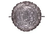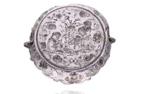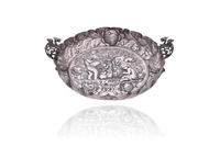Centro meta' dell'800, realizzato in argento 800, decorato a sbalzo e cesello con putti ed elementi floreali, manici con draghi a fusione applicata, h 7 x 22 x 19,5, difetti - Grammi 259,50