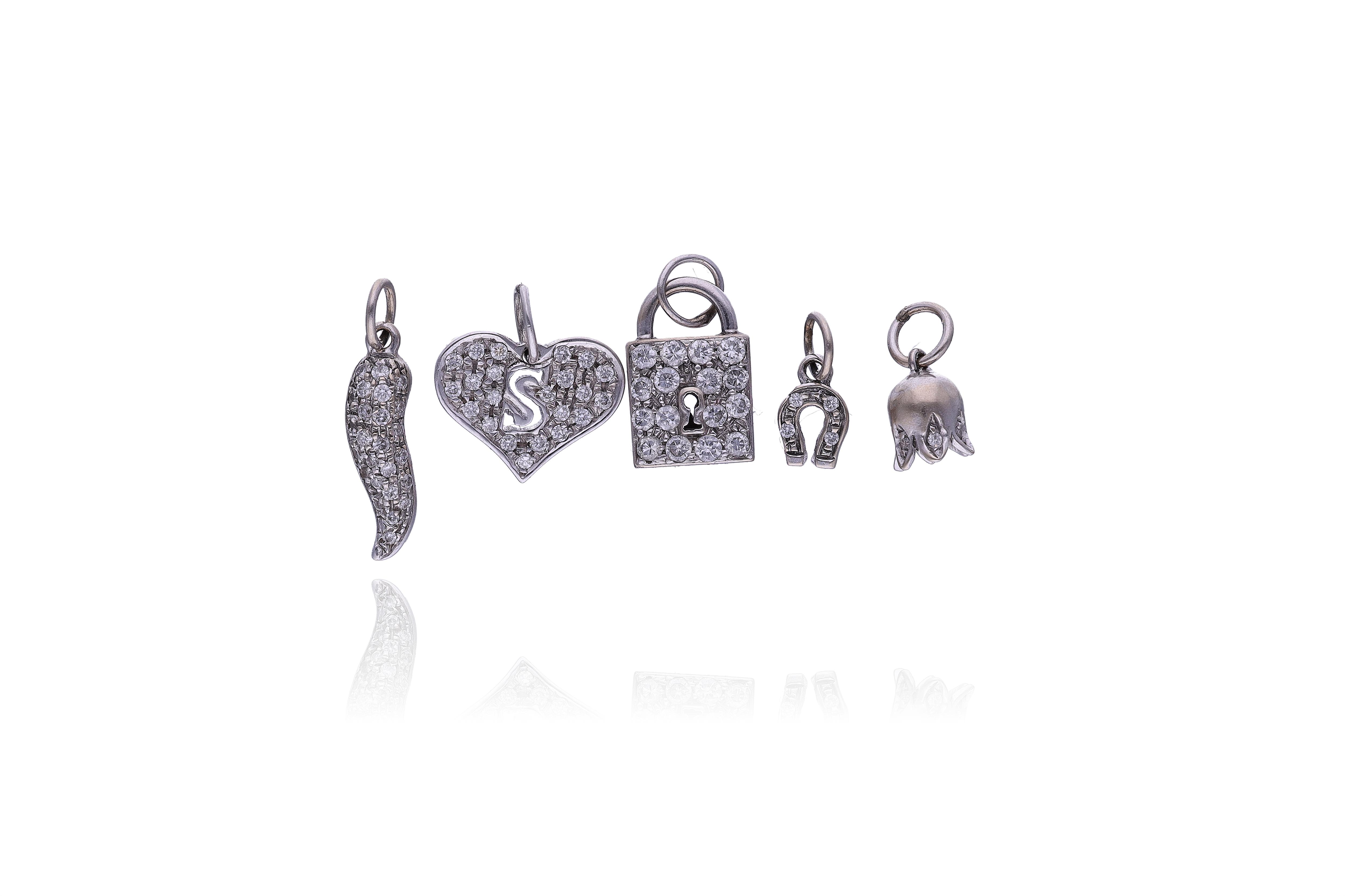 Cinque ciondoli con diamanti, in oro bianco 750, diamanti taglio brillante ct 0,60 totali circa, colore H-J, purezza VS-SI, imperfezioni - Grammi 4,20