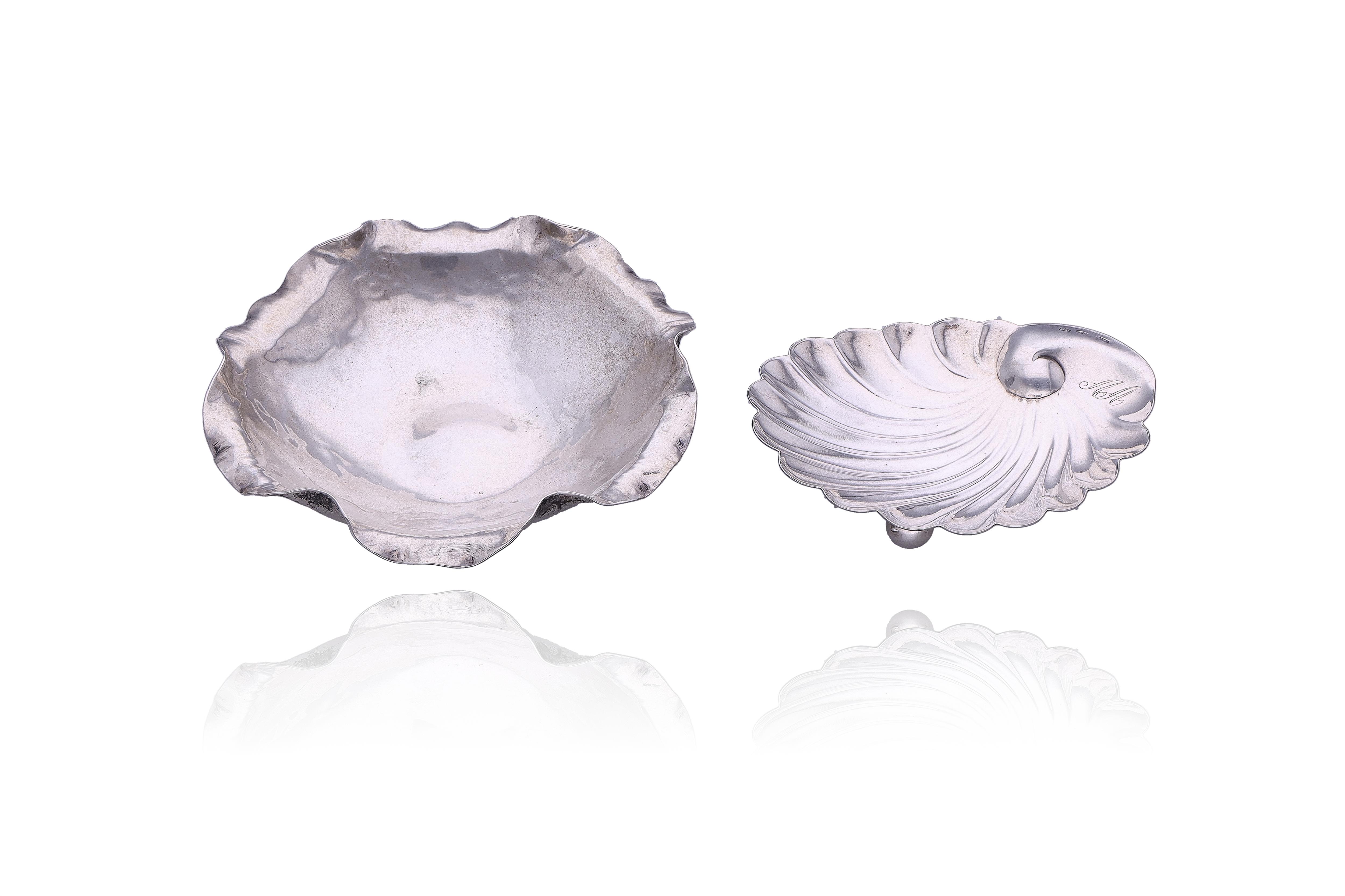 Piccolo centro a conchiglia 9 x 7 cm con incisioni e piccolo centro floreale diam 11 x 3 cm con incisioni, realizzati in argento 800, imperfezioni - Grammi 88,60