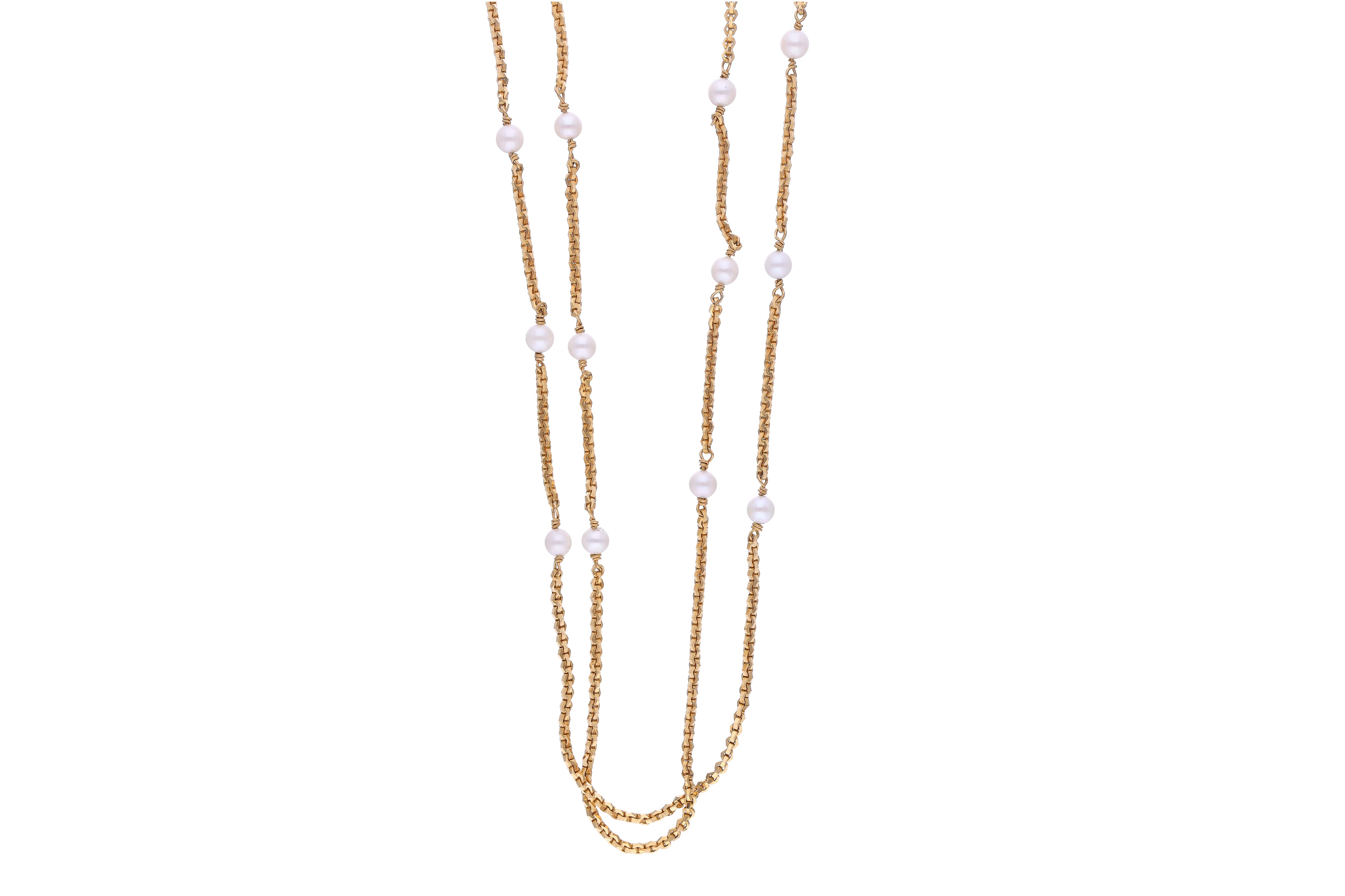 Collana con perle coltivate, realizzata in oro miglior titolo, perle coltivate 5,30 - 5,50 mm, lunghezza 60 cm, parti ammaccate, difetti - Grammi 41,60