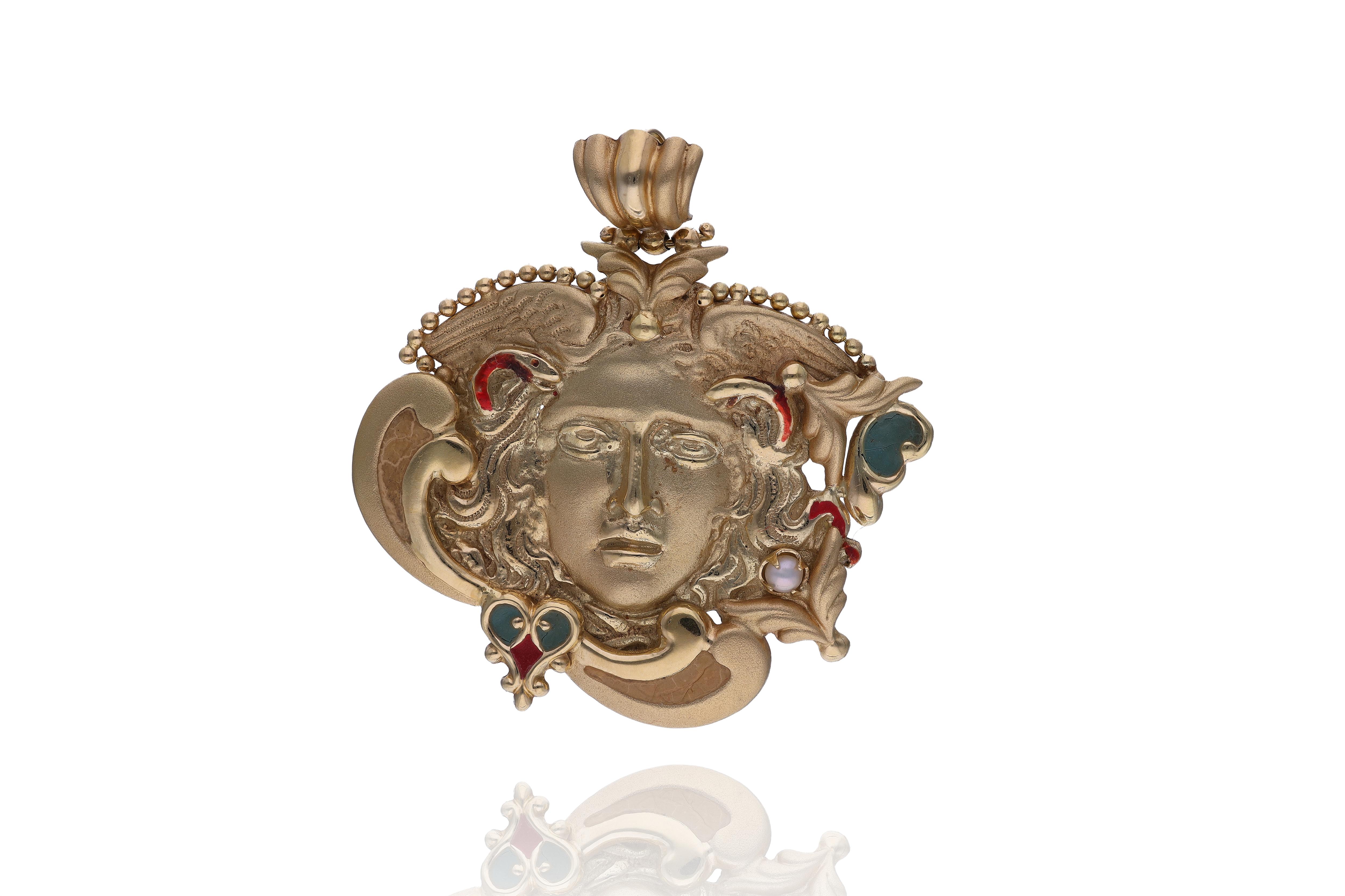 Ciondolo con smalti e perla coltivata, realizzato in oro giallo 750, smalti con scheggiature, lievi difetti - Grammi 15,40
