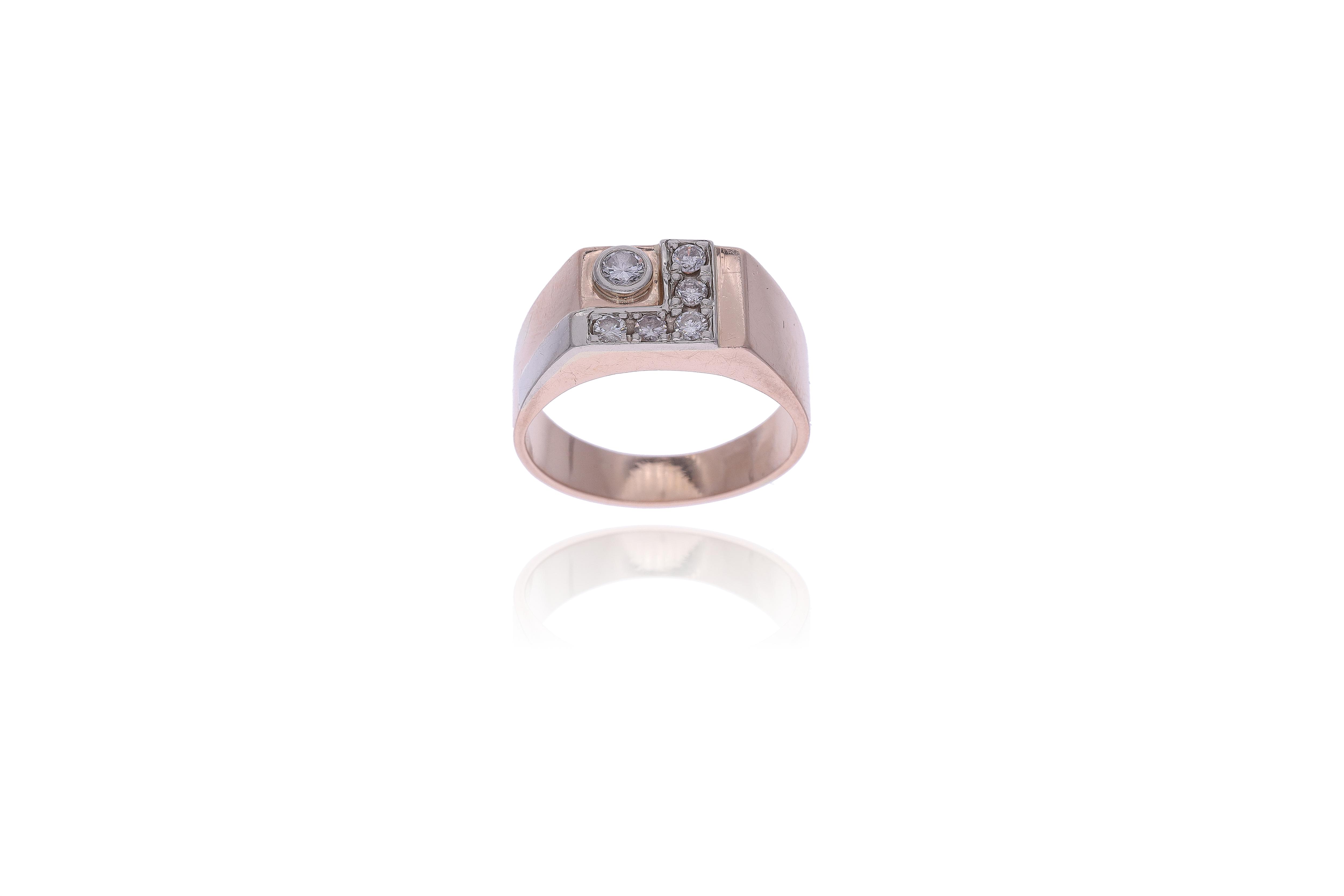 Anello con diamanti, realizzato in oro 585, diamante taglio brillante ct 0,15 circa, affiancato da diamanti taglio brillante ct 0,35 totali circa, colore H-J, purezza VS-SI, misura 23, difetti - Grammi 8,00