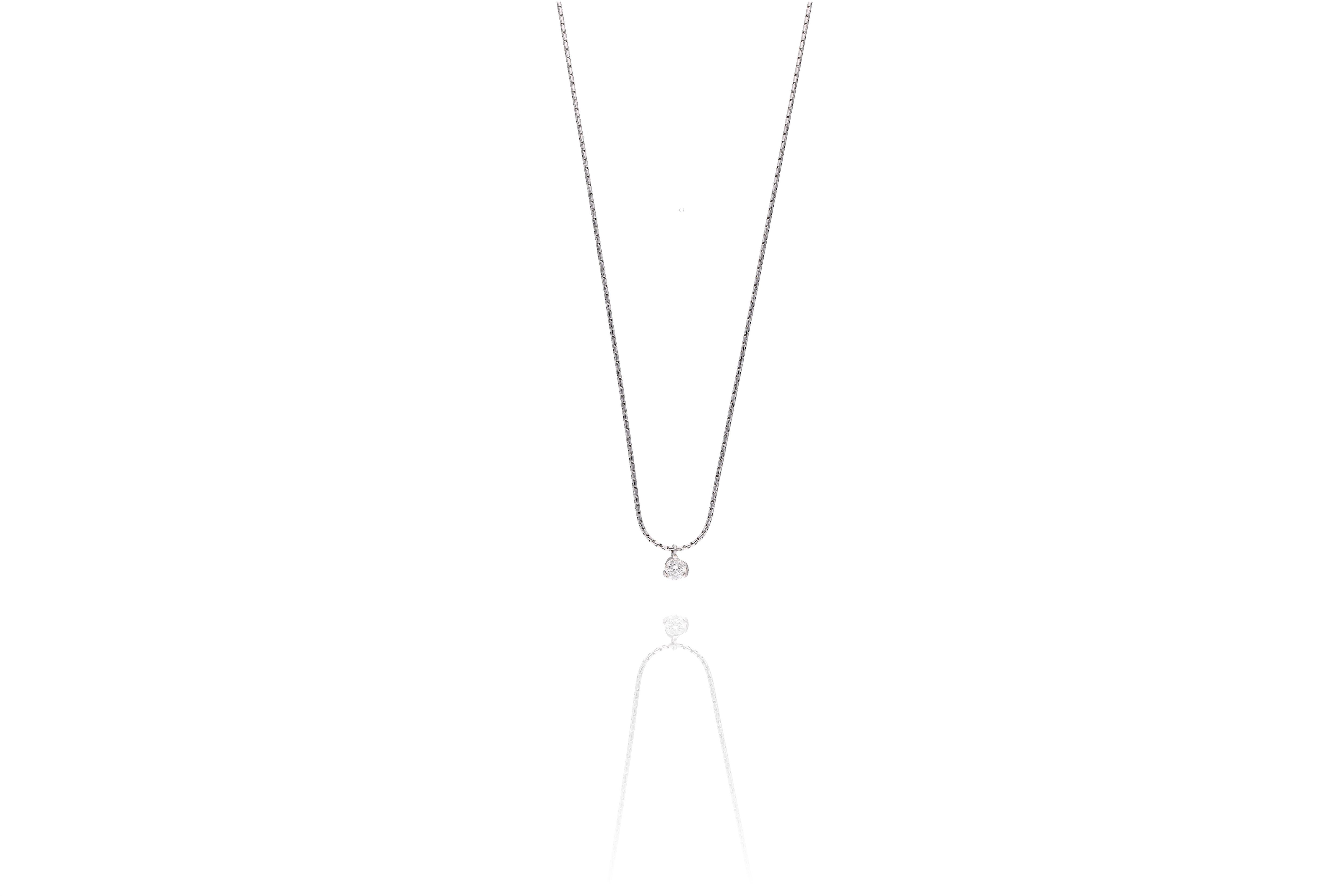 Collana con pendente con diamante, realizzato in oro bianco 750, diamante taglio brillante, ct 0,30 totali circa, colore J-L, purezza VS-SI, lunghezza 50 cm, imperfezioni - Grammi 5,10